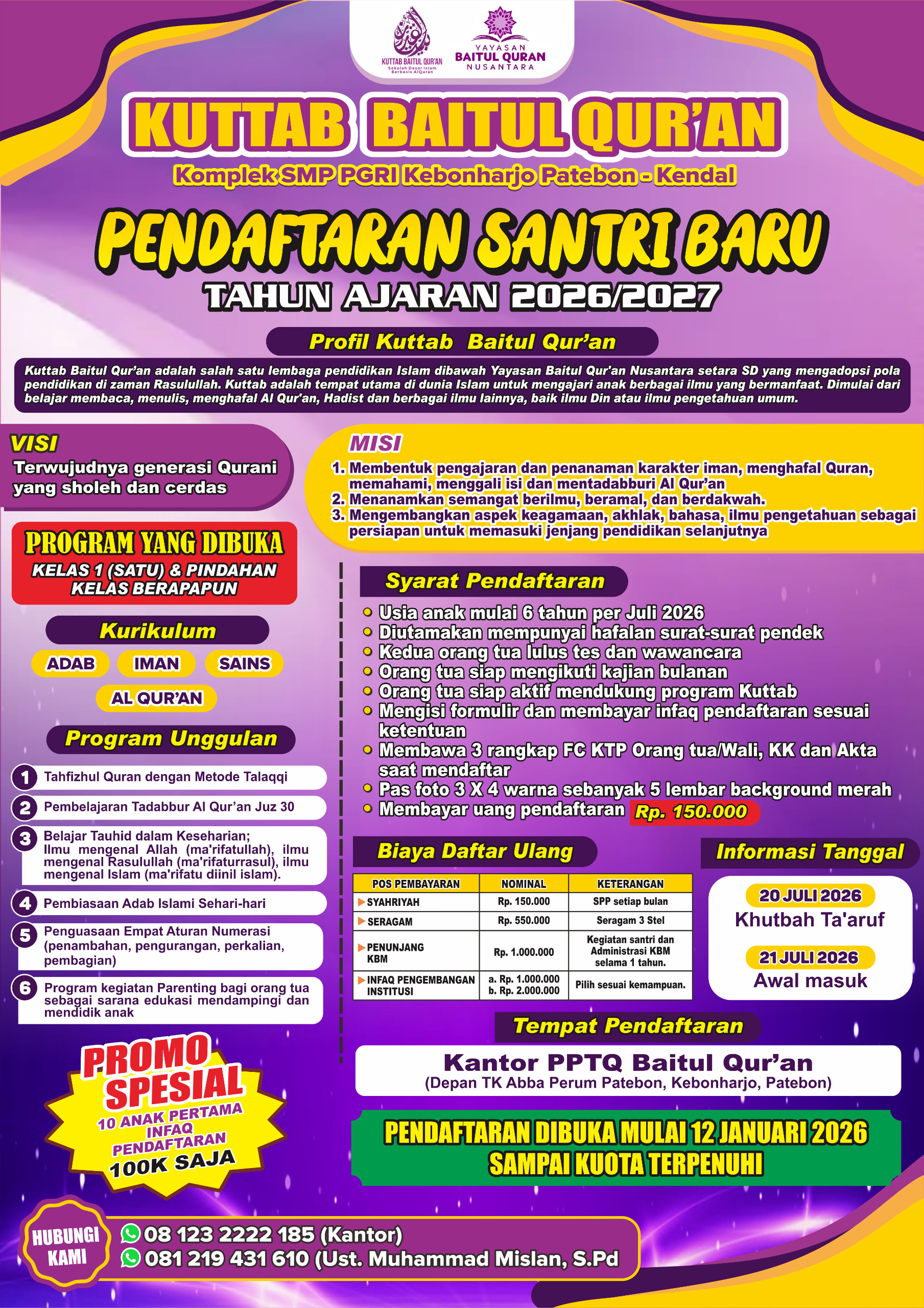 Alhamdulillah program santri tahfidz periode tahun 2026/2027 telah dibuka. Silahkan isi formulir dibawah ini atau silahturahim langsung ke kantor Yayasan Baitul Quran Nusantara